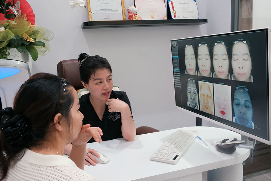 Thăm khám và phân tích da chuyên sâu cùng máy Visia. Nhận phác đồ trị liệu từ bác sĩ.