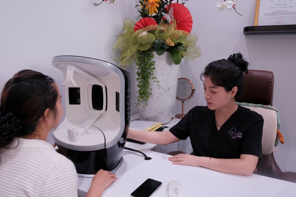 - Sử dụng máy Visia để kiểm tra tình trạng mụn trên da.