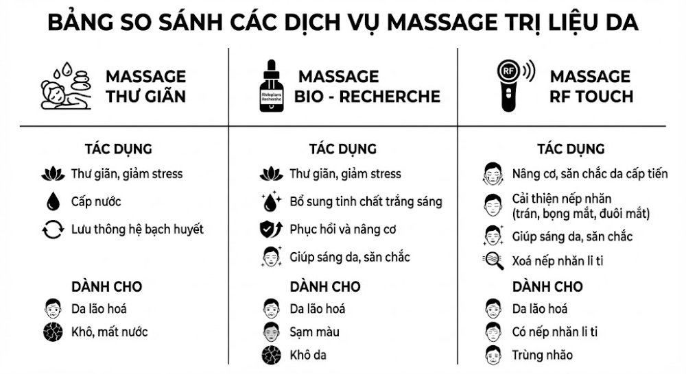 Massge thư giãn không chỉ giúp giảm căng thẳng thần kinh mà còn mang lại nhiều lợi ích về thể chất. Các tác dụng chính bao gồm thư giãn toàn diện, giảm stress, cấp nước tức thì cho làn da khô và mất nước, đồng thời thúc đẩy lưu thông hệ bạch huyết, giảm sưng tấy hoặc mệt mỏi.